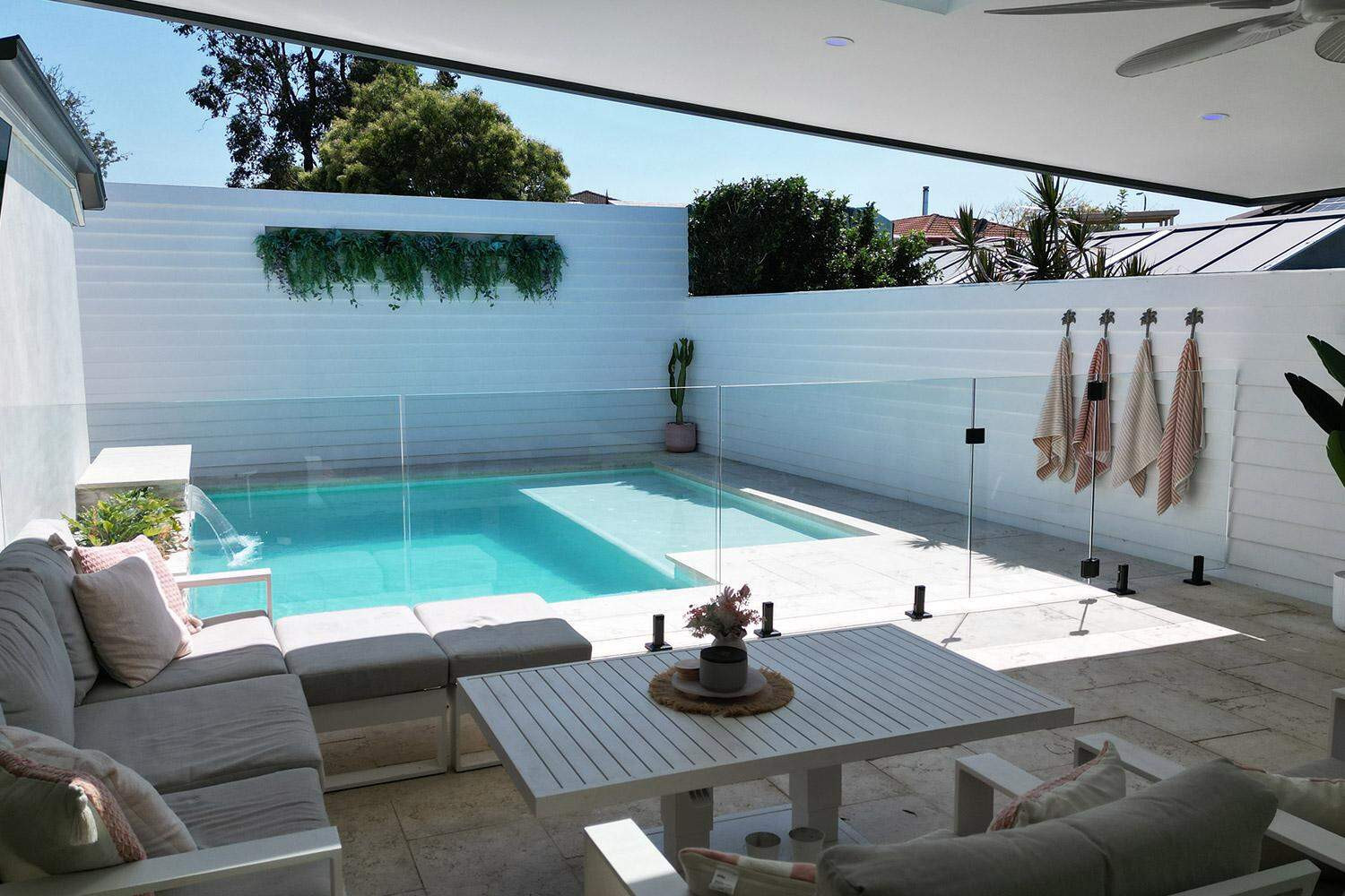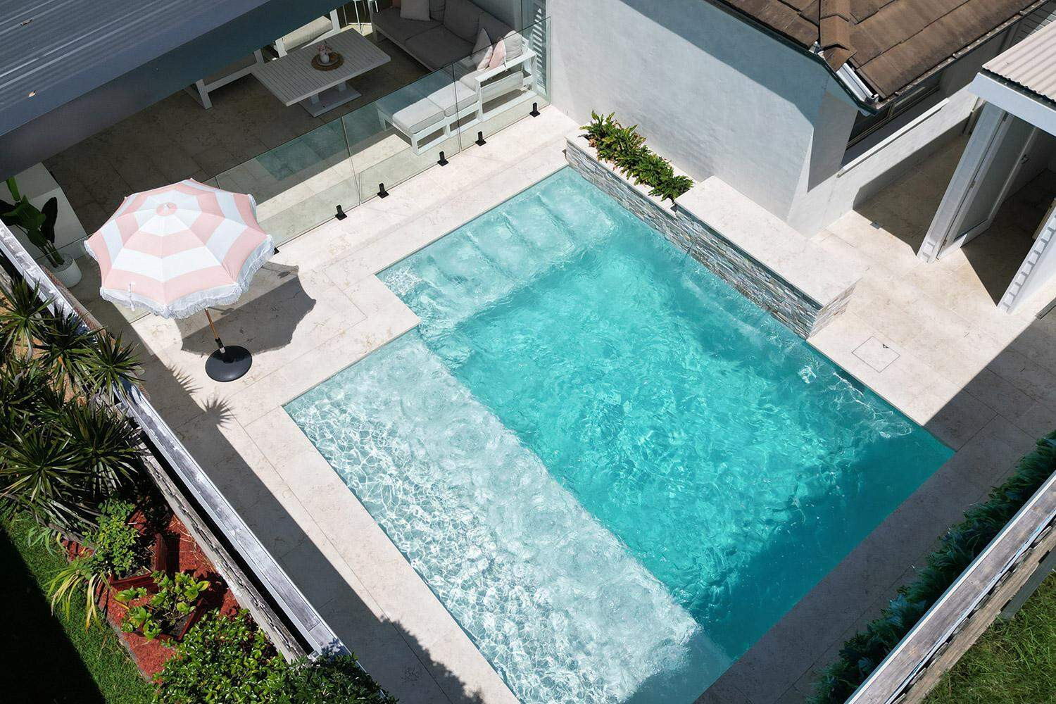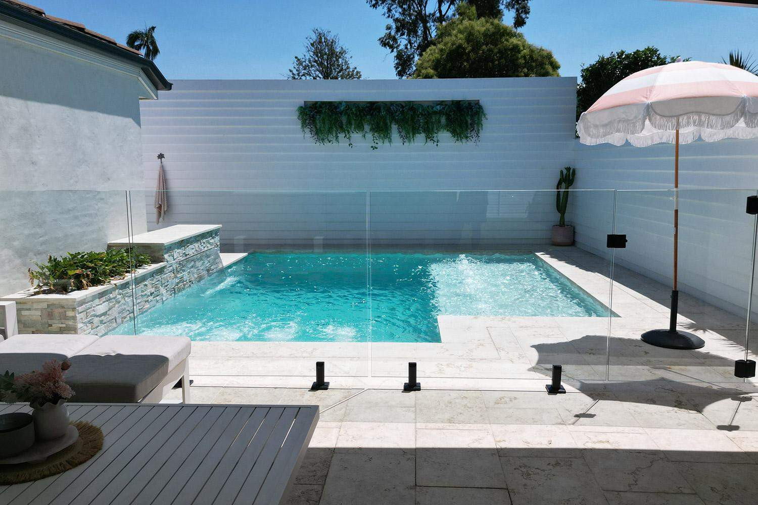 Despite previous advice that a pool was impossible due to a main sewer line, we investigated and found it had been encased by the developer. With this in mind, I designed a pool perfectly suited to the small space. The 300mm deep bench sits directly over the sewer, providing a great spot for kids and adults to relax. This innovative solution turned a challenging site into a stunning, functional pool, exceeding the client’s expectations