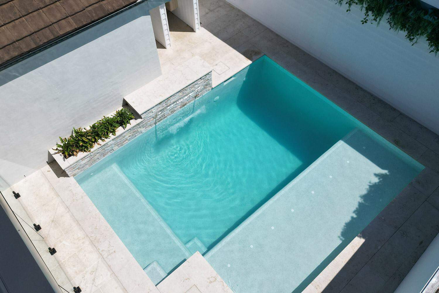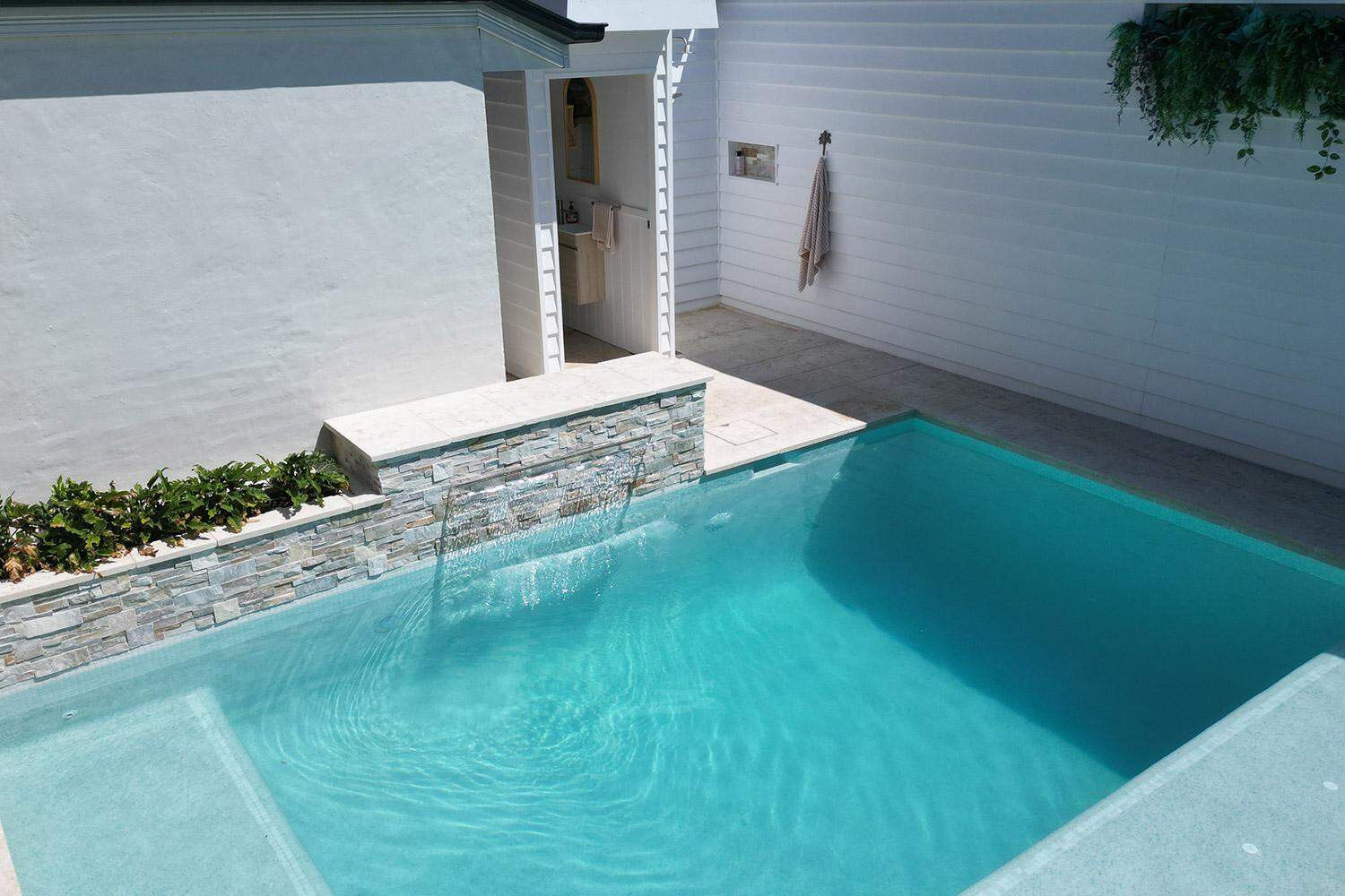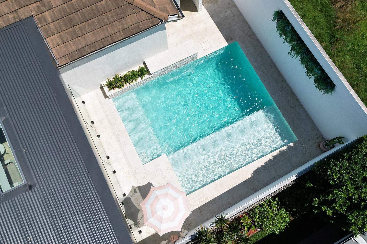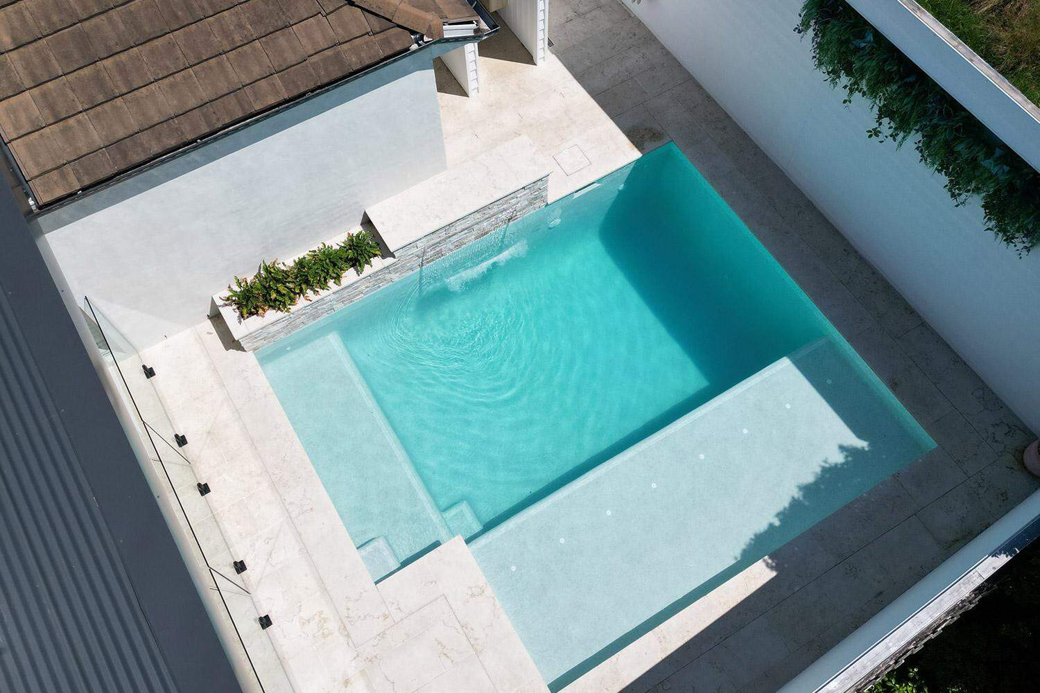 Despite previous advice that a pool was impossible due to a main sewer line, we investigated and found it had been encased by the developer. With this in mind, I designed a pool perfectly suited to the small space. The 300mm deep bench sits directly over the sewer, providing a great spot for kids and adults to relax. This innovative solution turned a challenging site into a stunning, functional pool, exceeding the client’s expectations