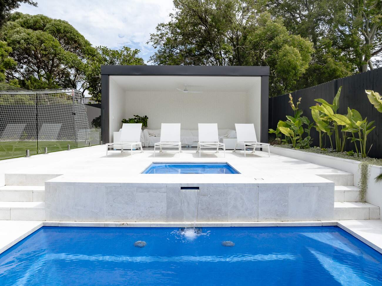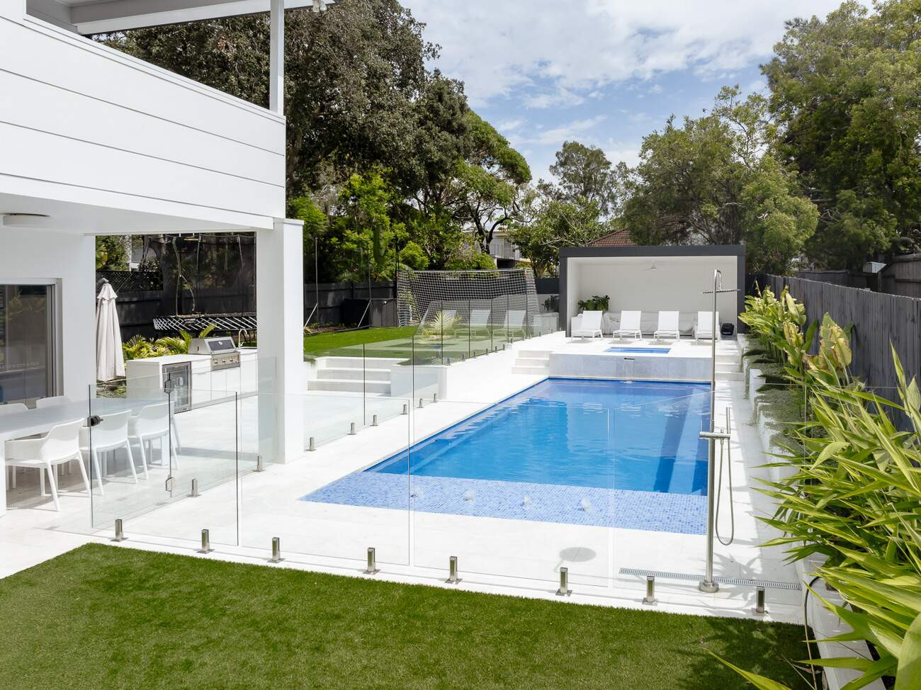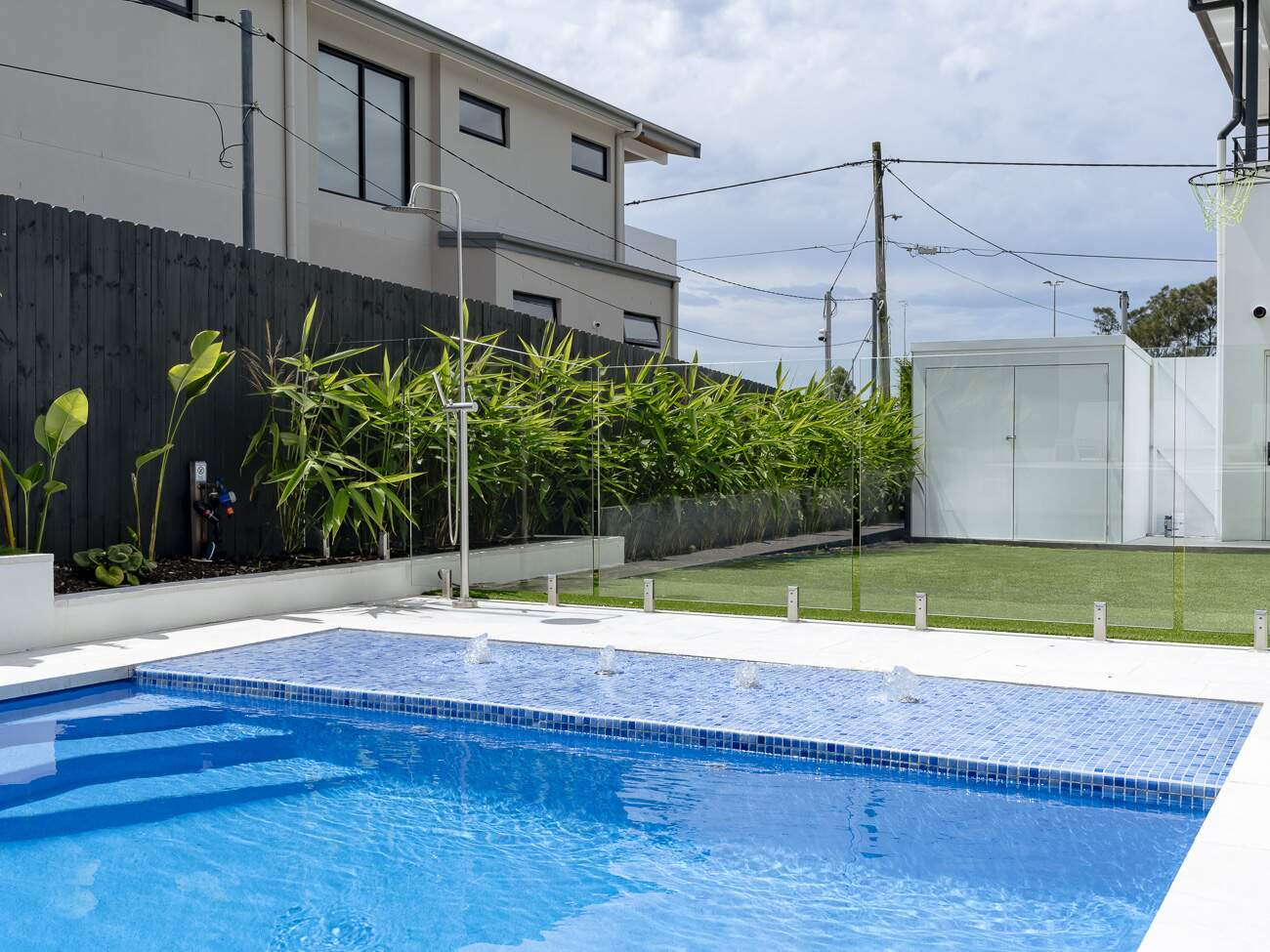 In North Curl Curl, this 9m x 4m fibreglass pool with integrated spa transforms a challenging site into a stunning coastal retreat. Built into the natural slope, it features a sleek Horizon finish, stone-clad retaining walls, timber decking with bench seating, and frameless glass fencing for uninterrupted views. The spa adds year-round appeal, blending luxury and functionality. A true showcase of innovation, craftsmanship, and client vision.