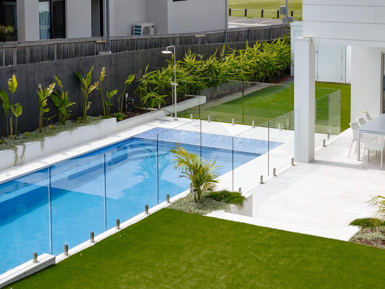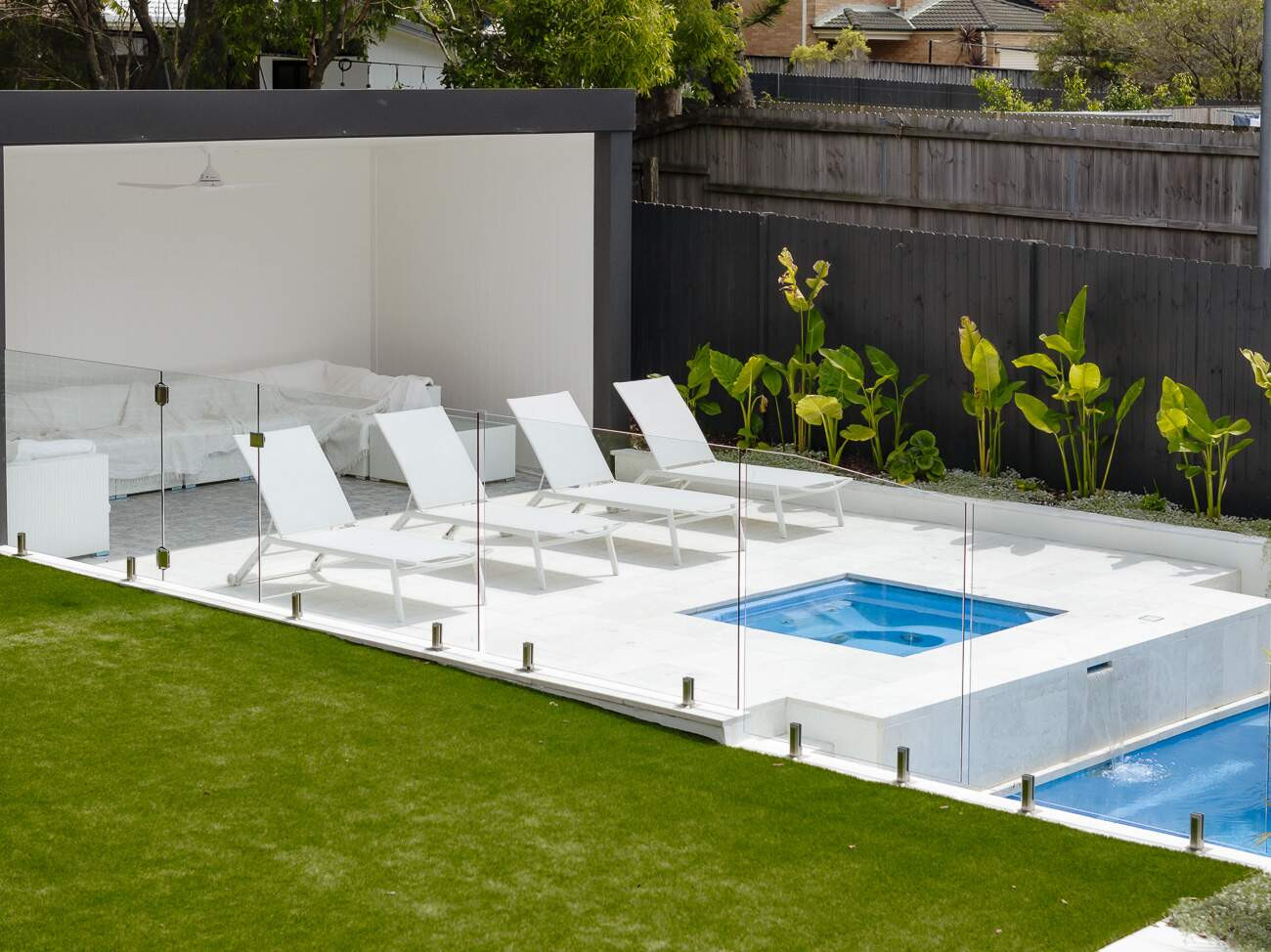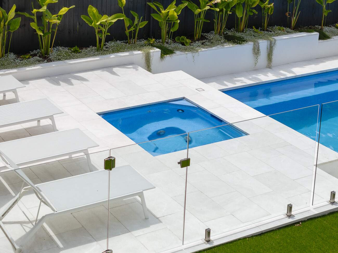 In North Curl Curl, this 9m x 4m fibreglass pool with integrated spa transforms a challenging site into a stunning coastal retreat. Built into the natural slope, it features a sleek Horizon finish, stone-clad retaining walls, timber decking with bench seating, and frameless glass fencing for uninterrupted views. The spa adds year-round appeal, blending luxury and functionality. A true showcase of innovation, craftsmanship, and client vision.