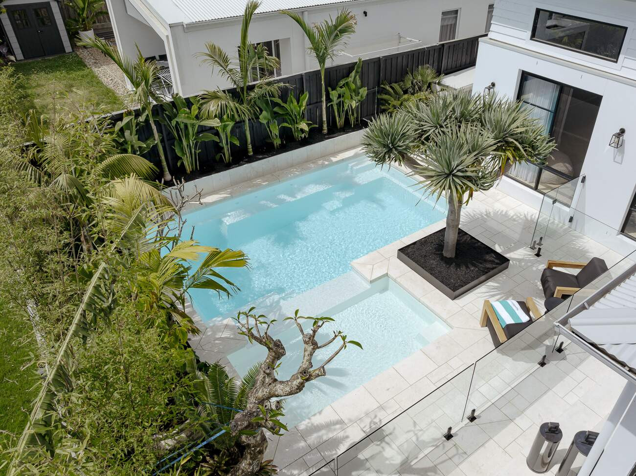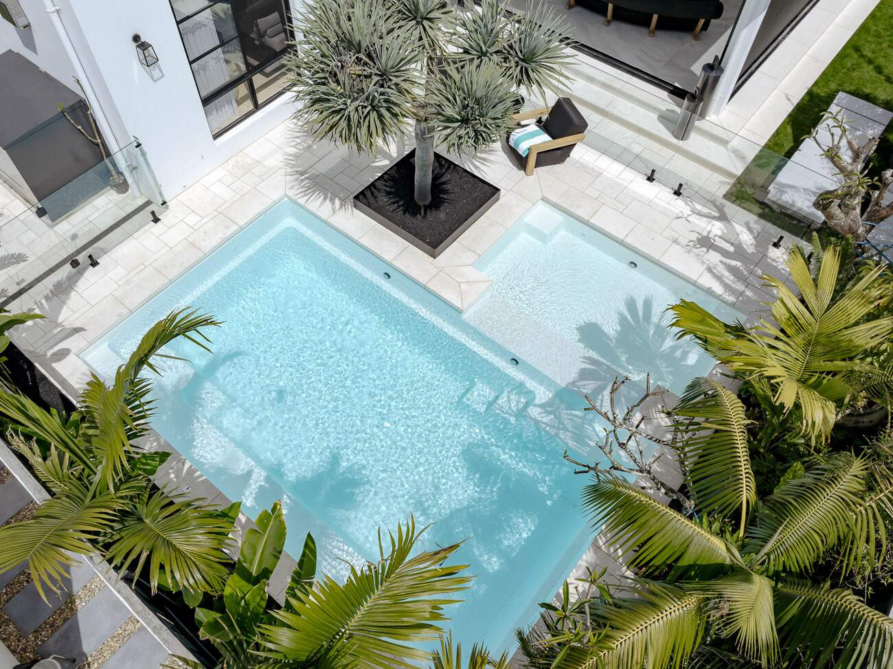 This project creatively integrates a pool and wading pool in a tight space, working around a large focal tree. Using negative edges and a custom spillway, we seamlessly connected the two areas while maintaining separation. Strategic positioning kept the space open and the tree as a central feature. The design transformed space limitations into an opportunity, resulting in a striking and functional outdoor retreat.