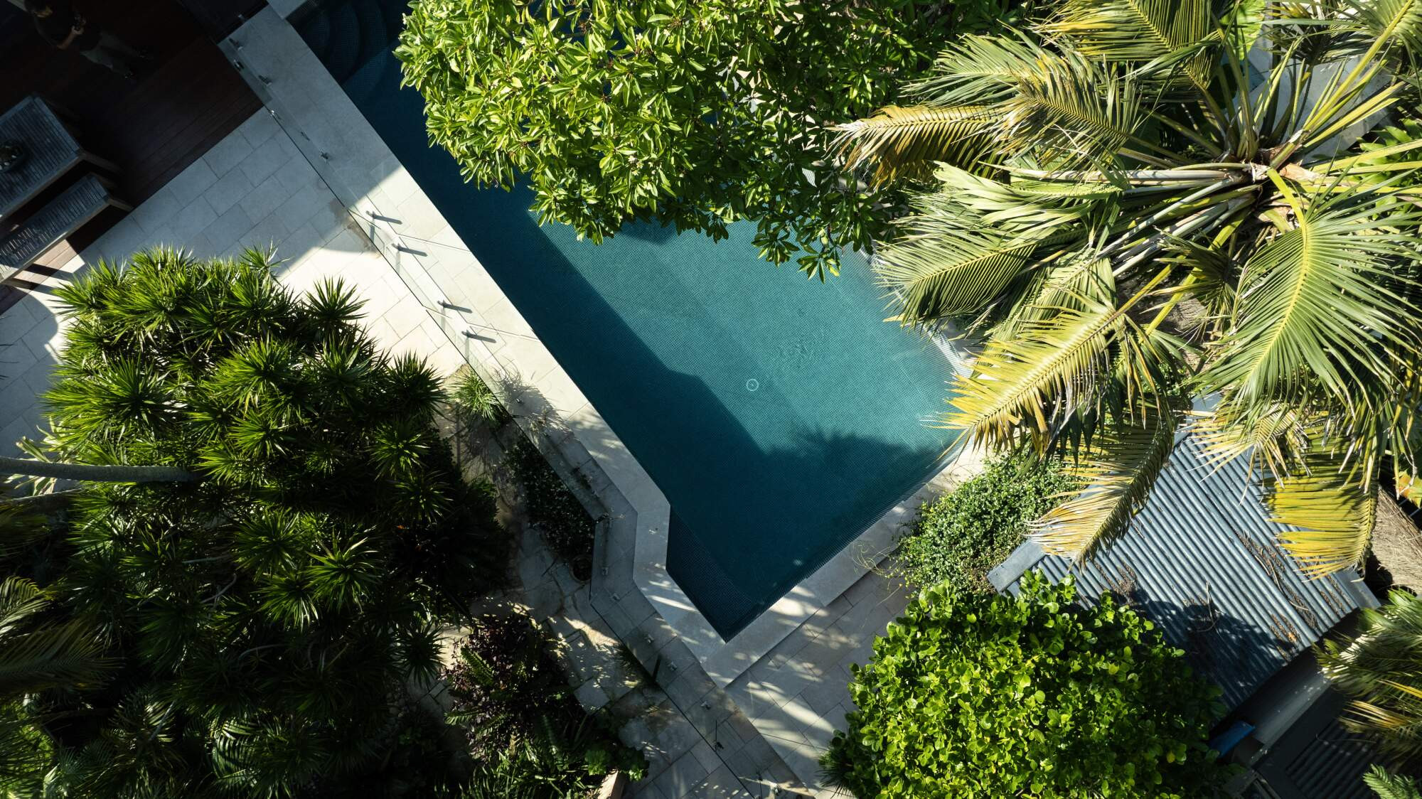 We've created a pool that transcends the ordinary, where sea, sand, and verdant life converge. This project masterfully creates a deep, oceanic tone, achieved with striking dark tiles, against a backdrop of sun-kissed natural stone and flourishing greenery.